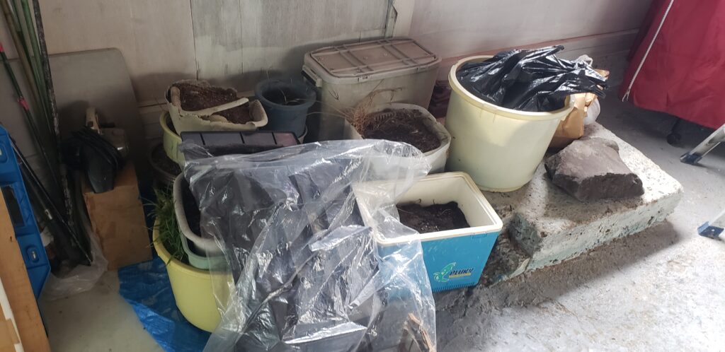 ✅[ビフォー写真:ガレージの隅に植木鉢・プランター土・ブロック・ガレキが山積み]📸