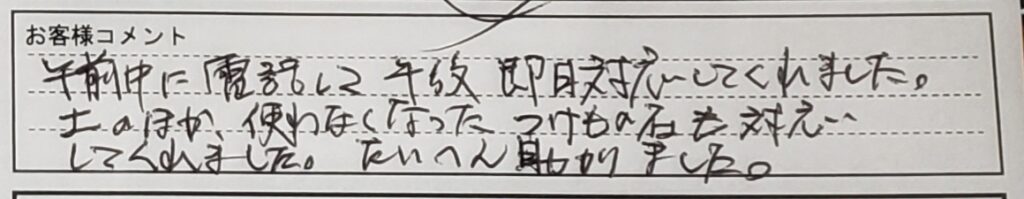 くれました。土のほか使わなくなったつけもの石も対応してくれました、たいへん助かりました。」